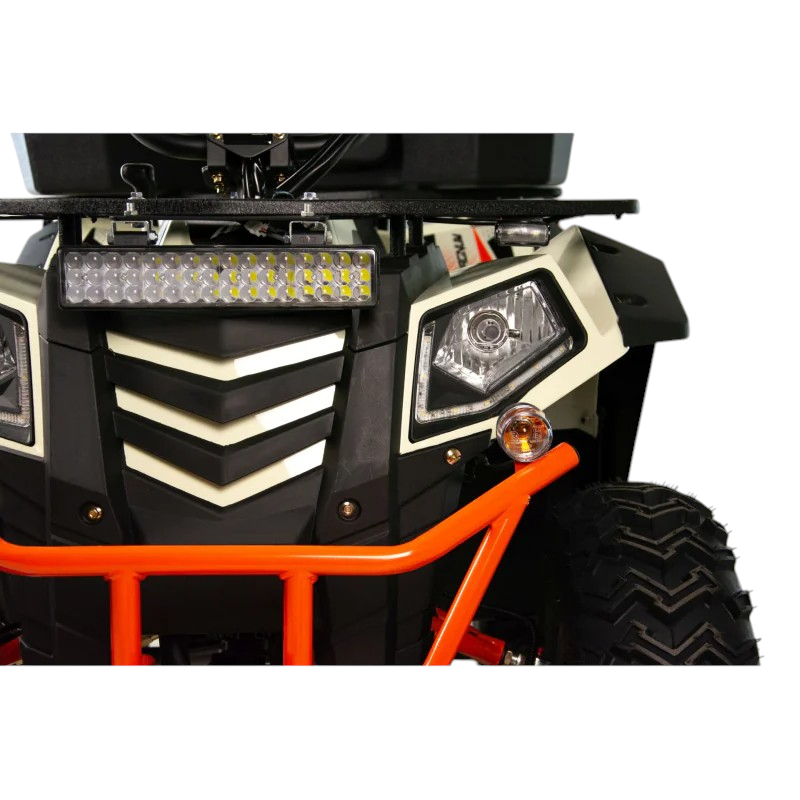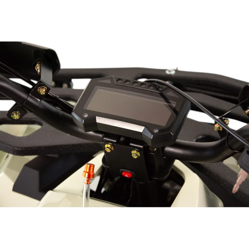• Quad wyposażony jest w automatyczną skrzynię biegów (1 bieg do przodu + wsteczny), cyfrowy licznik, oświetlenie LED oraz wiele funkcjonalnych dodatków, takich jak hak z gniazdem elektrycznym i handbary.