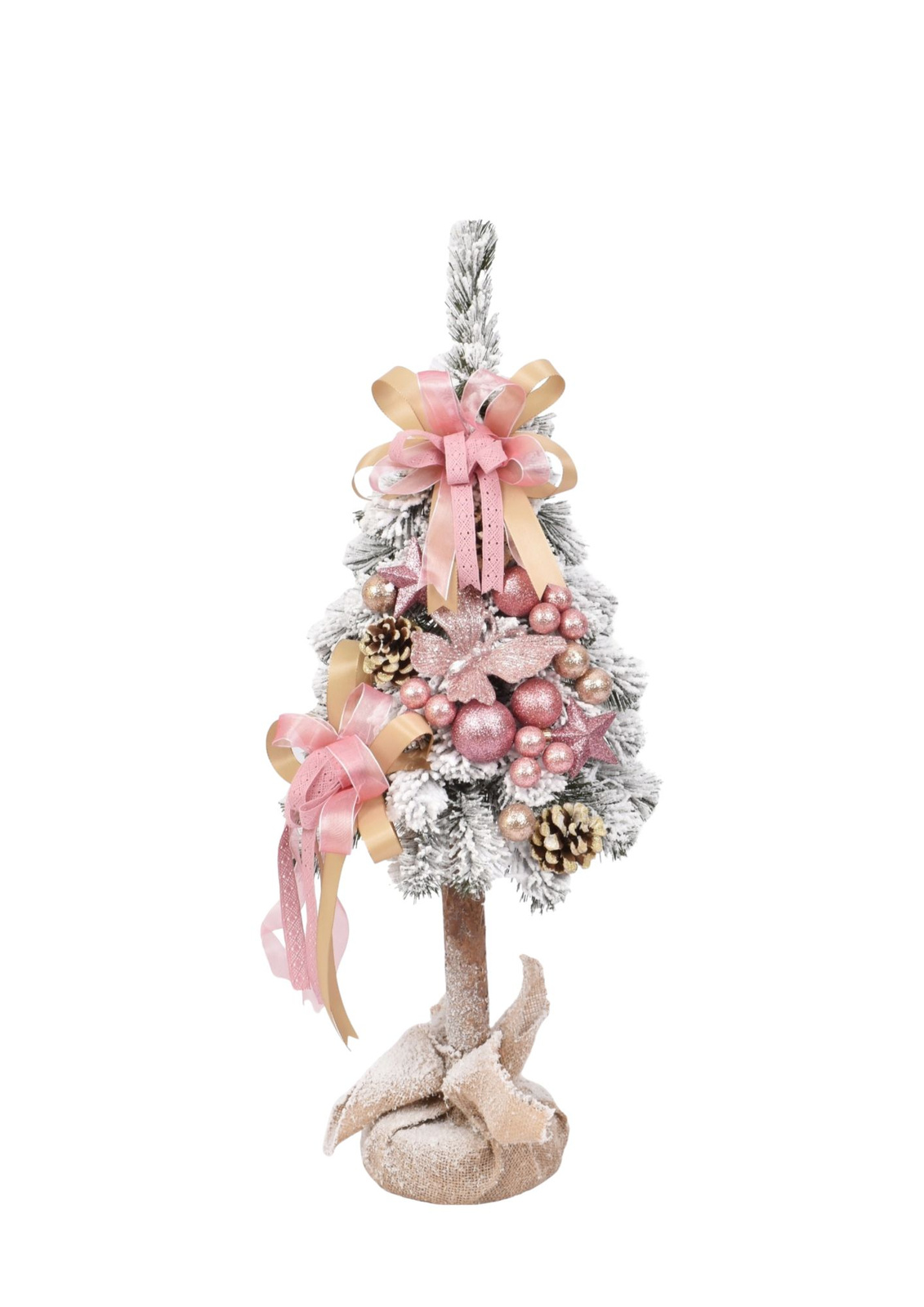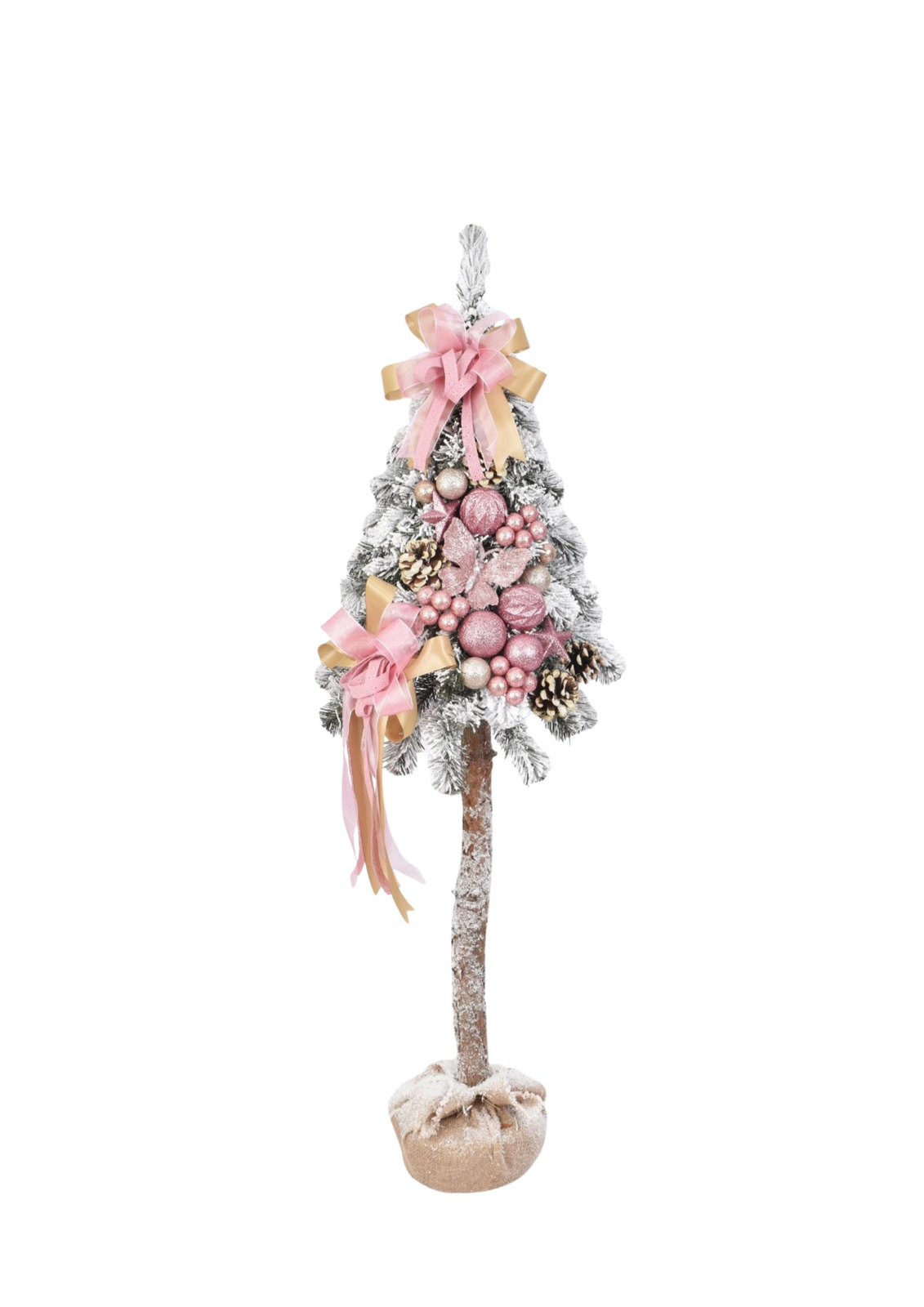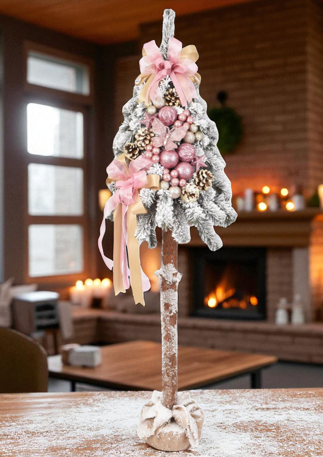 - Ekskluzywna choinka na pniu ze śnieżnionymi gałązkami, ozdobiona różowymi i złotymi dodatkami glamour, motylami i szyszkami – wnosi niepowtarzalny, świąteczny blask do każdego wnętrza. Idealna dekoracja na czas Bożego Narodzenia w stylu premium.