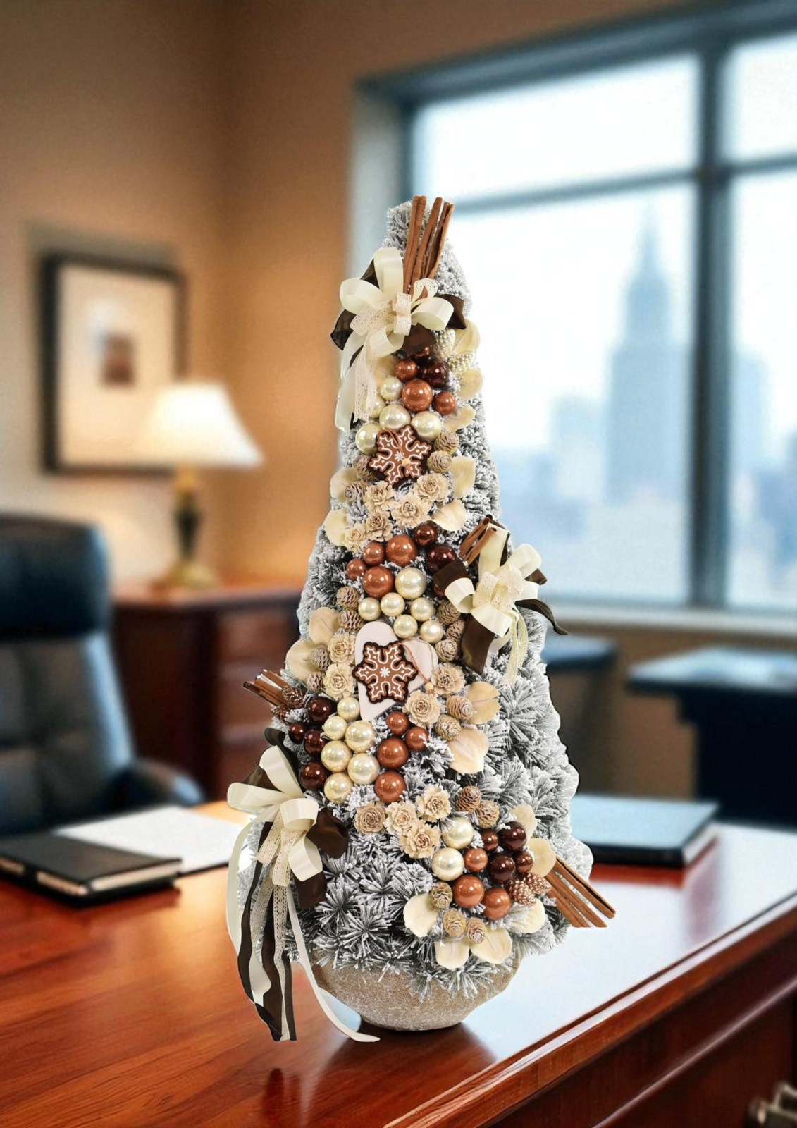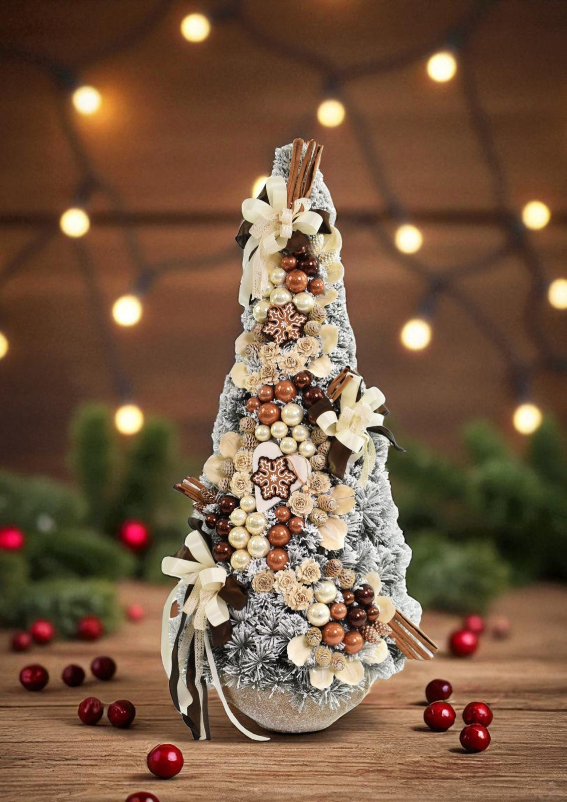 - Pokryta śnieżnioną zielenią, udekorowana bombkami w odcieniach złota i miedzi, szyszkami, cynamonem i kokardami wprowadzi do wnętrza ciepły, świąteczny klimat. Idealna do domu, biura lub jako wyjątkowy prezent na Boże Narodzenie.