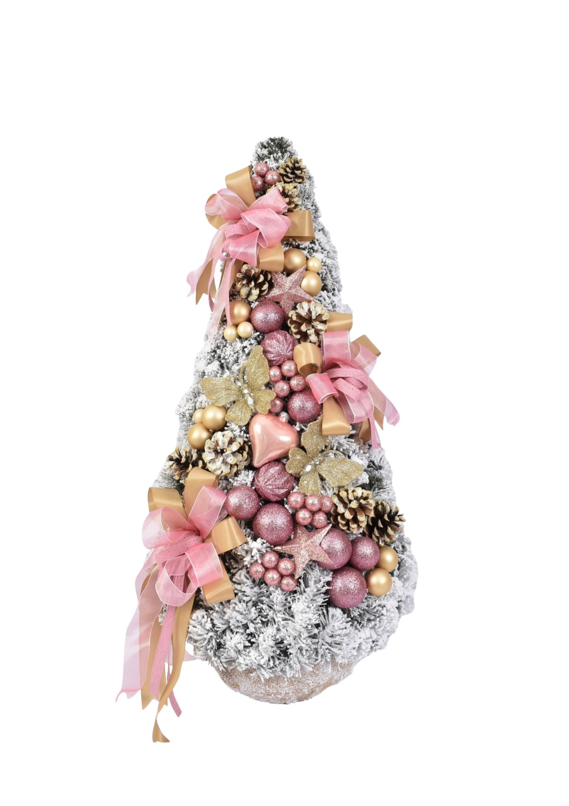 Wyjątkowa choinka stożkowa to gotowa kompozycja, która zachwyca subtelnymi, pastelowymi dekoracjami oraz bogactwem detali. Utrzymana w delikatnej kolorystyce różu i złota, przeplatana połyskującymi bombkami, złotymi motylami oraz eleganckimi szyszkami, idealnie wpisuje się w nowoczesne lub klasyczne aranżacje wnętrz.