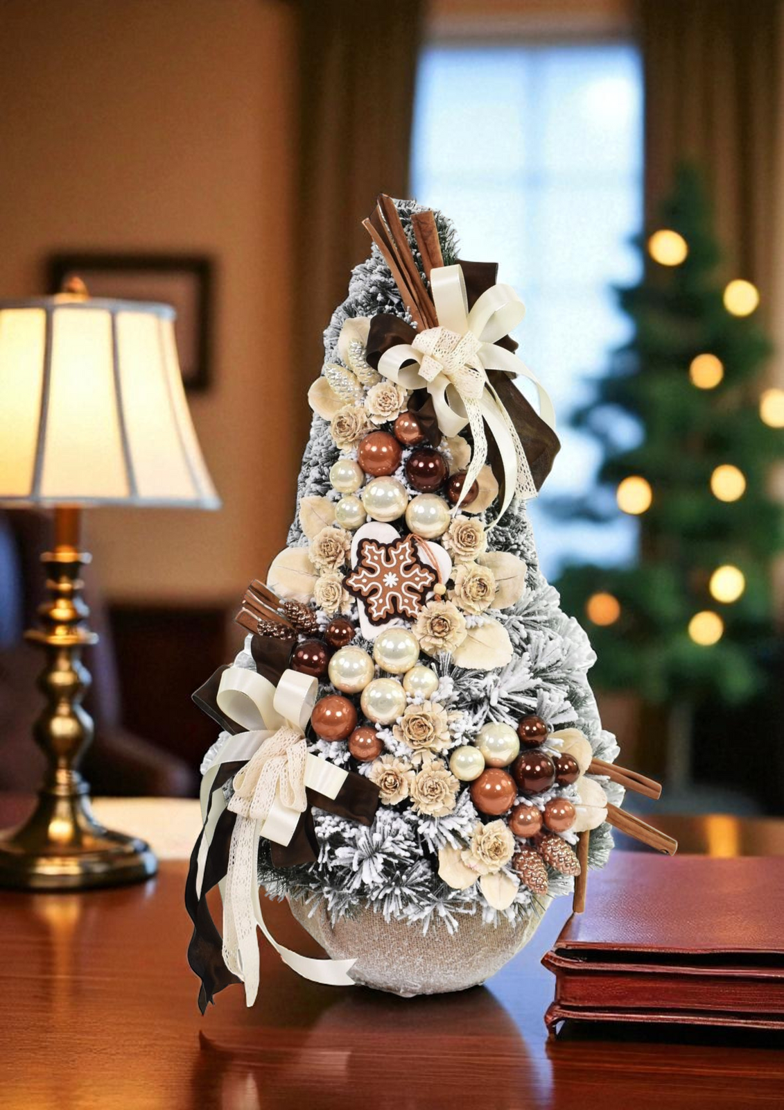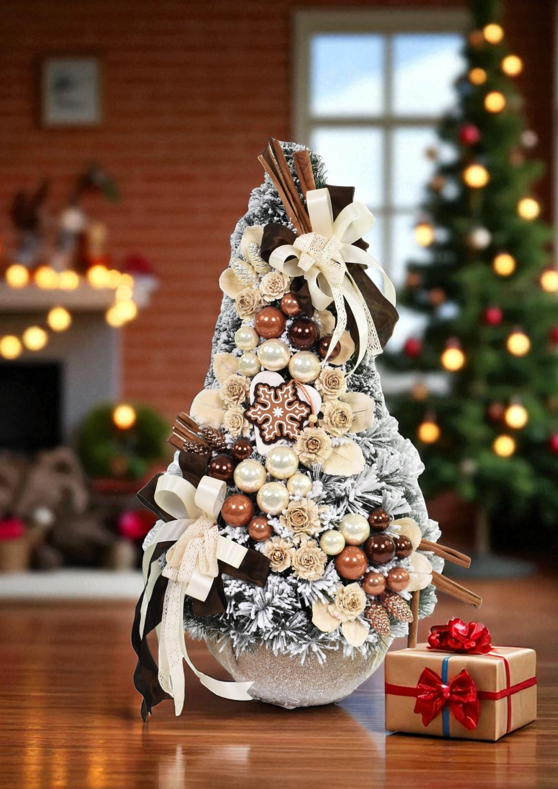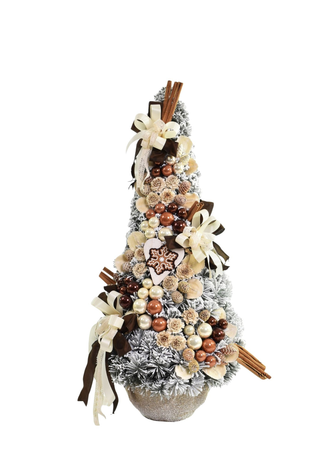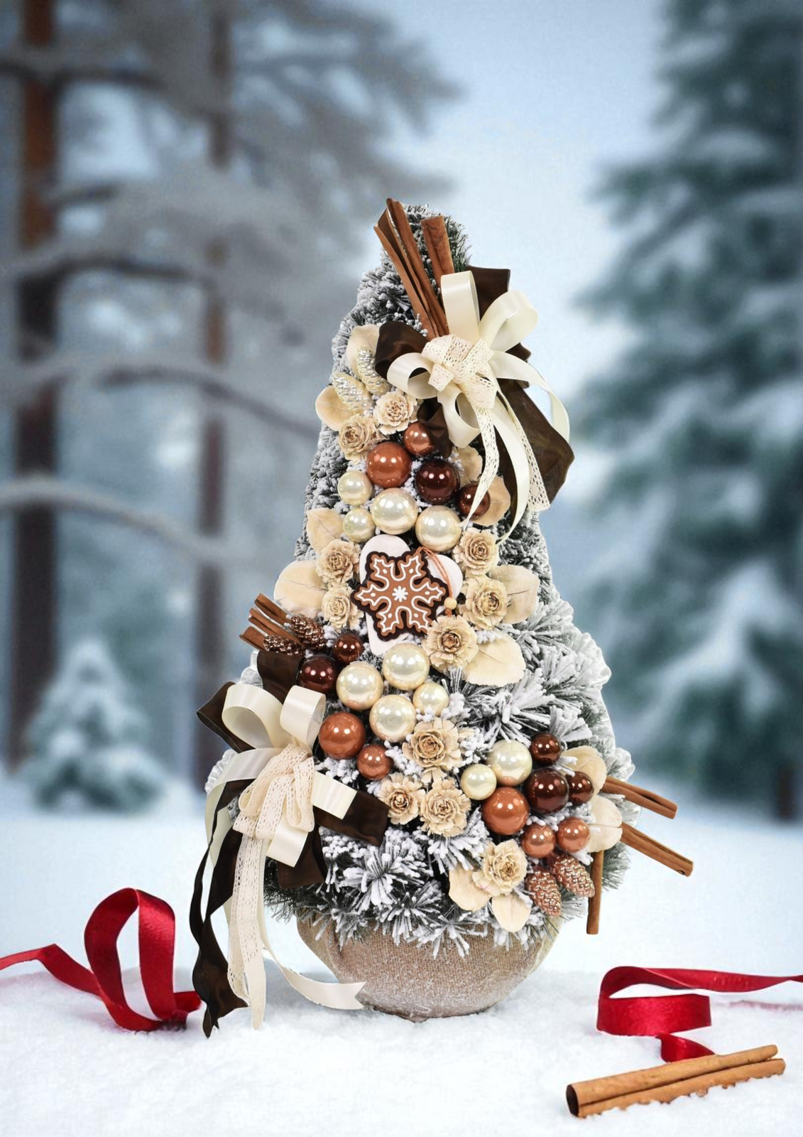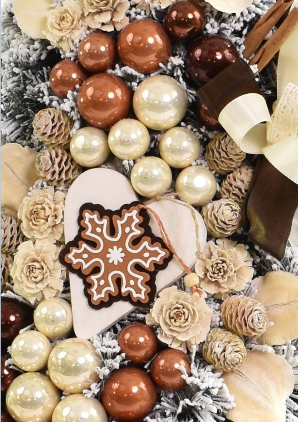 - Pokryta śnieżnioną zielenią, udekorowana bombkami w odcieniach złota i miedzi, szyszkami, cynamonem i kokardami wprowadzi do wnętrza ciepły, świąteczny klimat. Idealna do domu, biura lub jako wyjątkowy prezent na Boże Narodzenie.