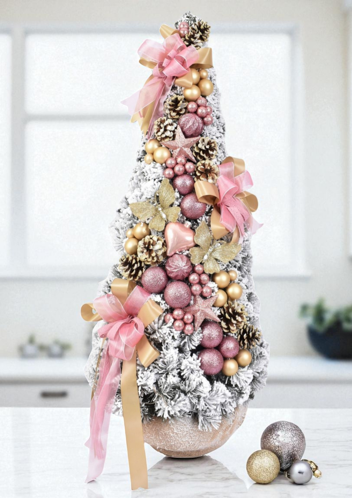 Wyjątkowa choinka stożkowa to gotowa kompozycja, która zachwyca subtelnymi, pastelowymi dekoracjami oraz bogactwem detali. Utrzymana w delikatnej kolorystyce różu i złota, przeplatana połyskującymi bombkami, złotymi motylami oraz eleganckimi szyszkami, idealnie wpisuje się w nowoczesne lub klasyczne aranżacje wnętrz.