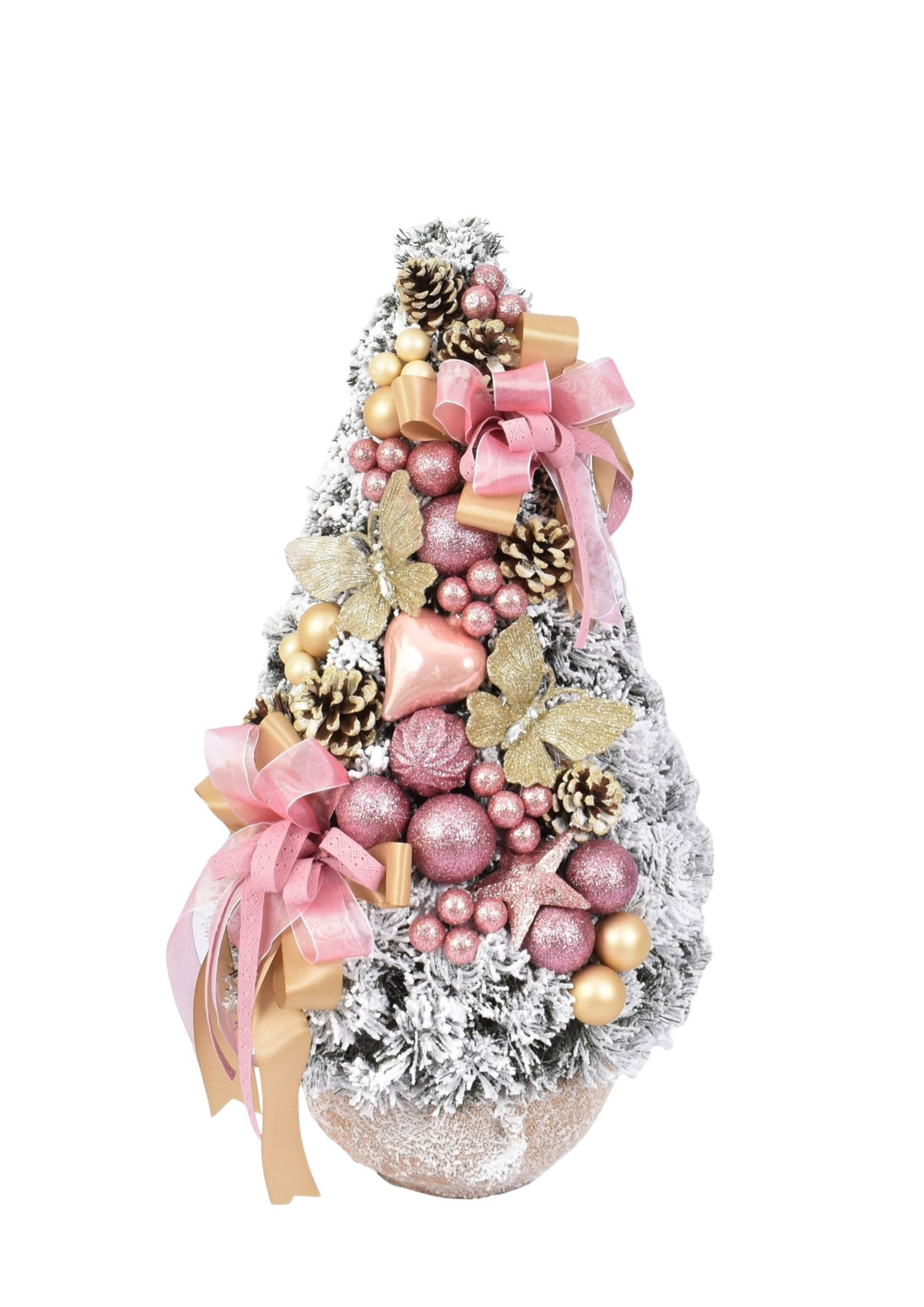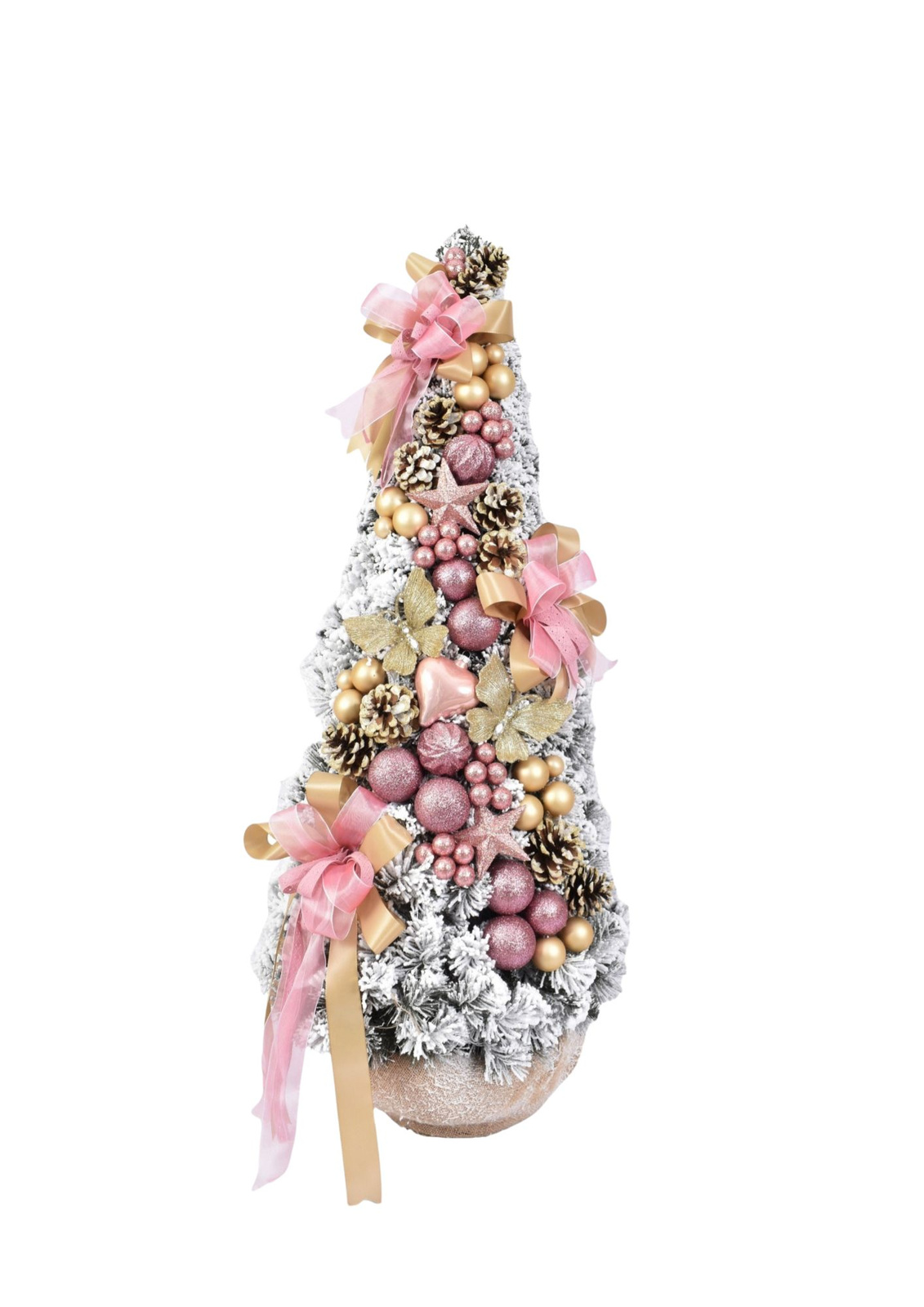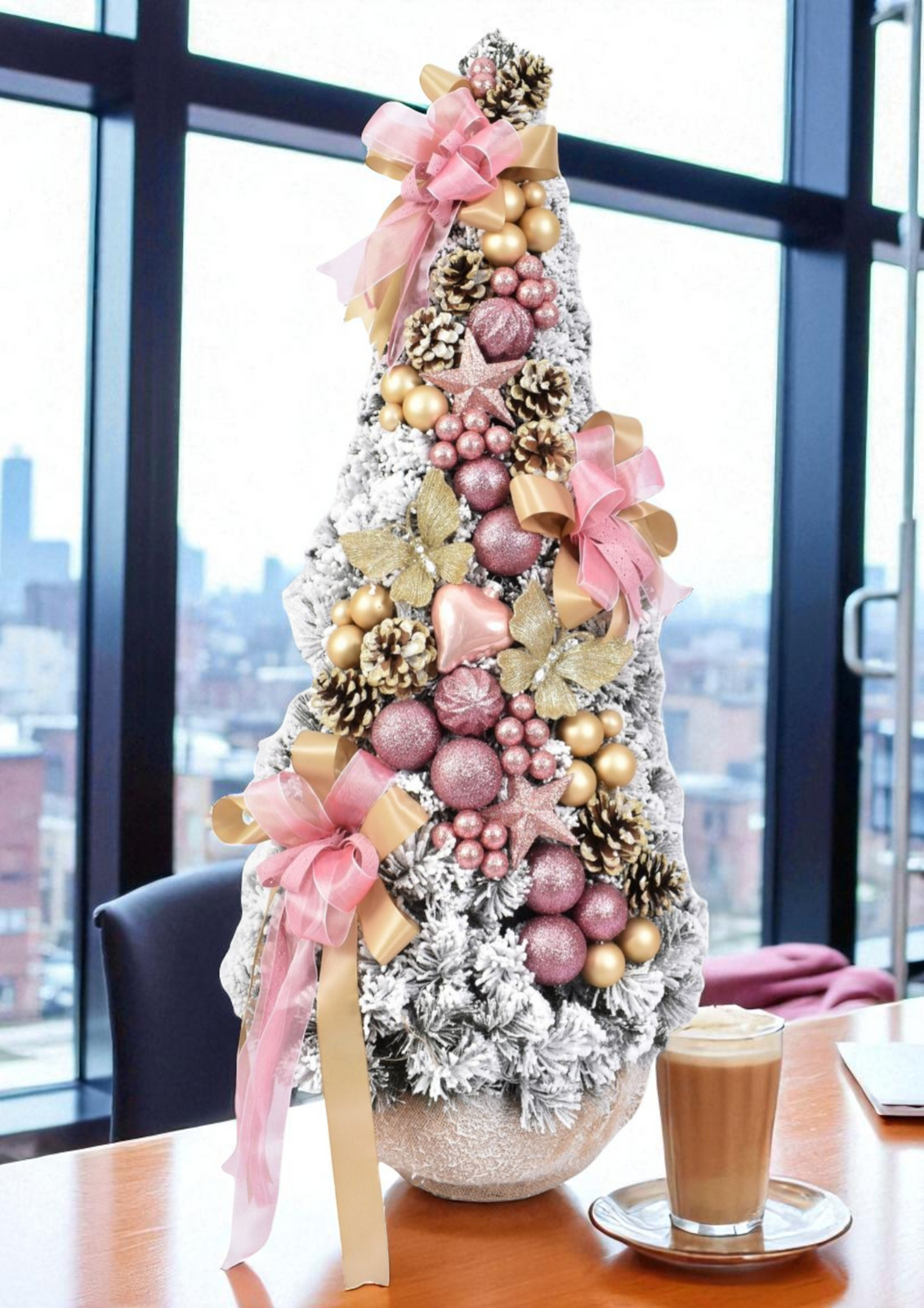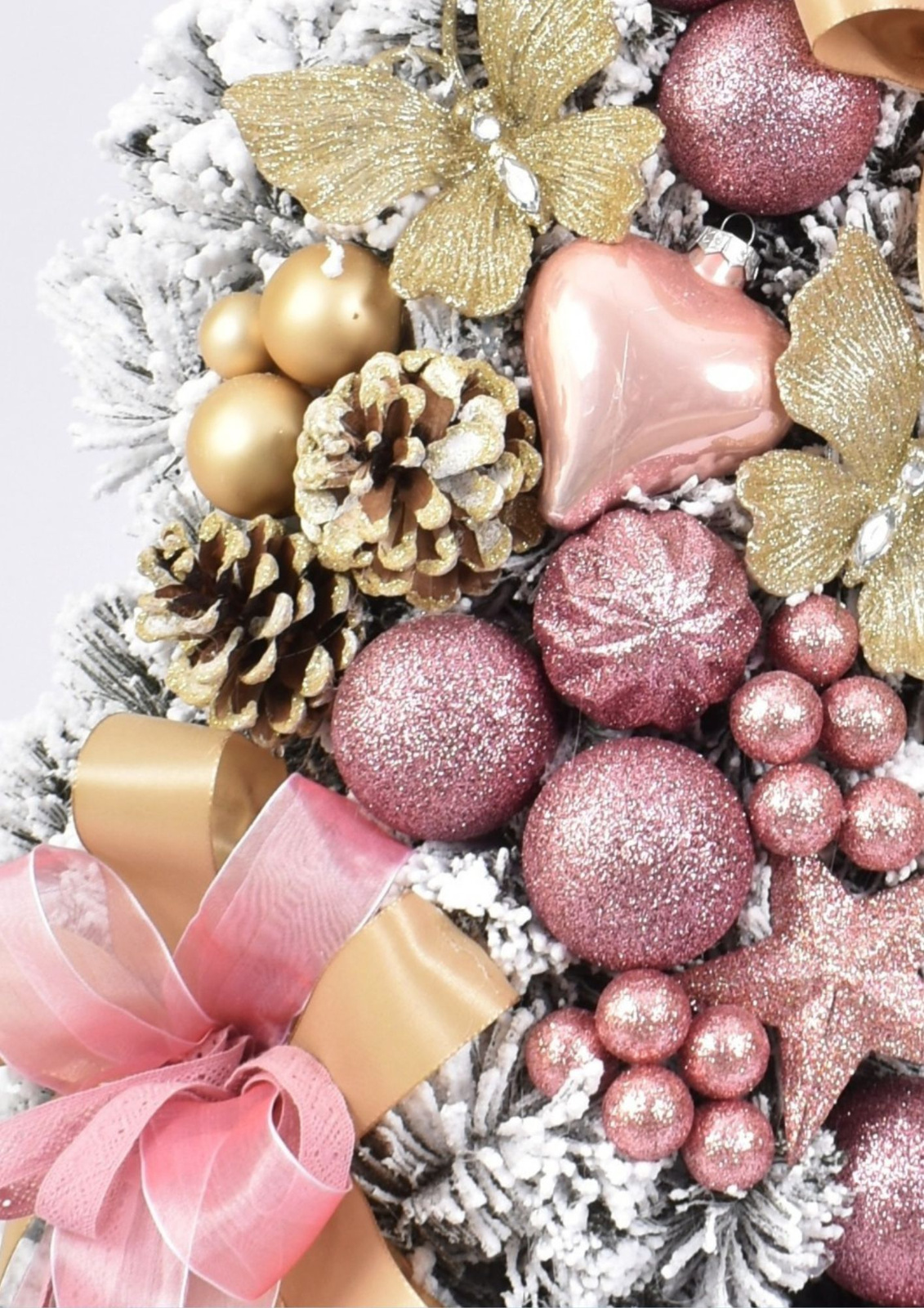 Wyjątkowa choinka stożkowa to gotowa kompozycja, która zachwyca subtelnymi, pastelowymi dekoracjami oraz bogactwem detali. Utrzymana w delikatnej kolorystyce różu i złota, przeplatana połyskującymi bombkami, złotymi motylami oraz eleganckimi szyszkami, idealnie wpisuje się w nowoczesne lub klasyczne aranżacje wnętrz.