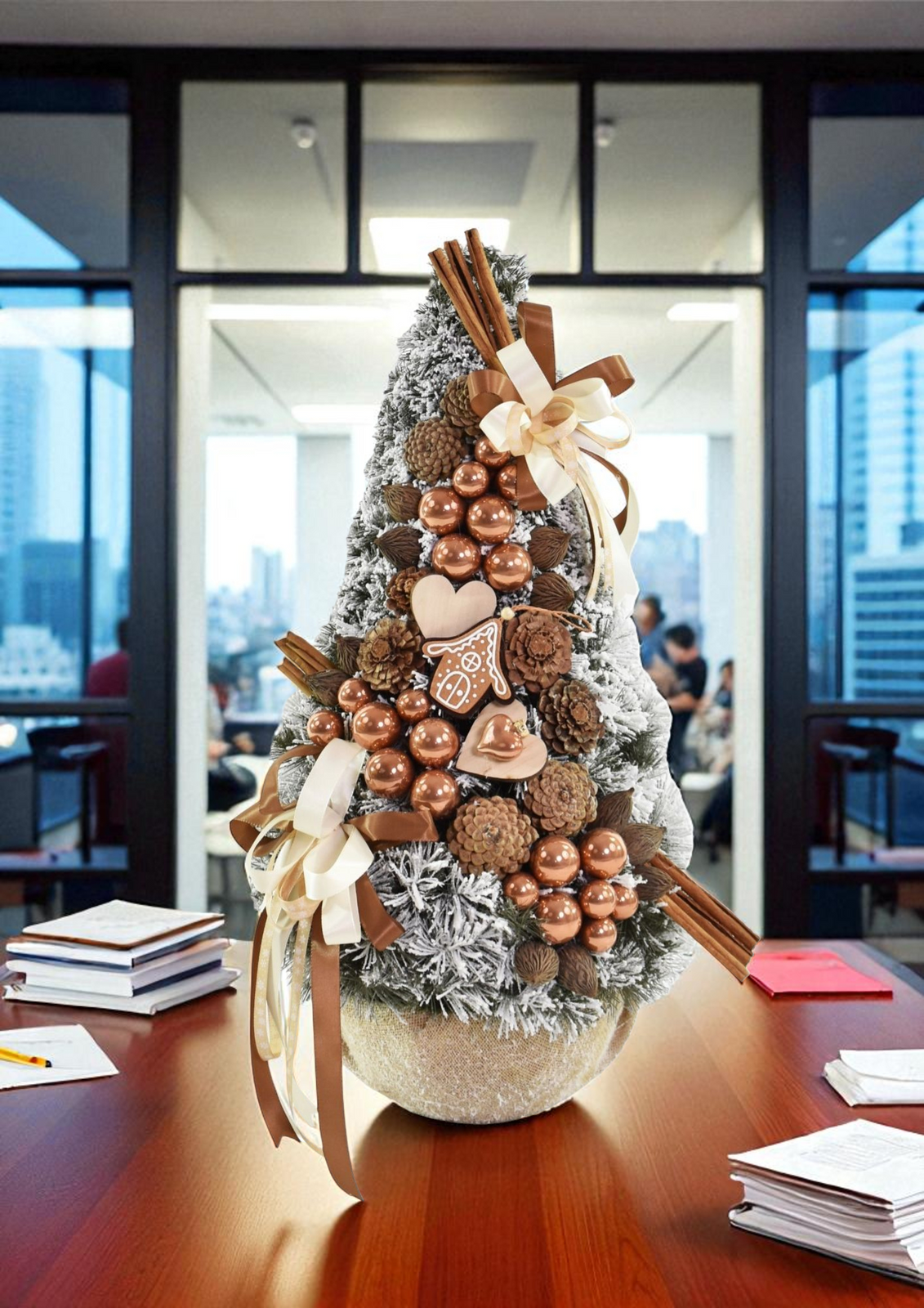Dekoracja została wykonana na bazie sztucznej, śnieżonej choinki osadzonej w jutowym worku, co zapewnia stabilność i naturalny wygląd. Ozdoby to starannie dobrane, połyskujące kule w odcieniach złota i miedzi, liczne szyszki oraz drewniane serduszka i domki, które nadają całości przytulnego, rustykalnego klimatu. Dodatkowe walory estetyczne zapewniają satynowe, kremowo-brązowe kokardy oraz aromatyczne laski cynamonu, które podkreślają unikalny charakter aranżacji.
