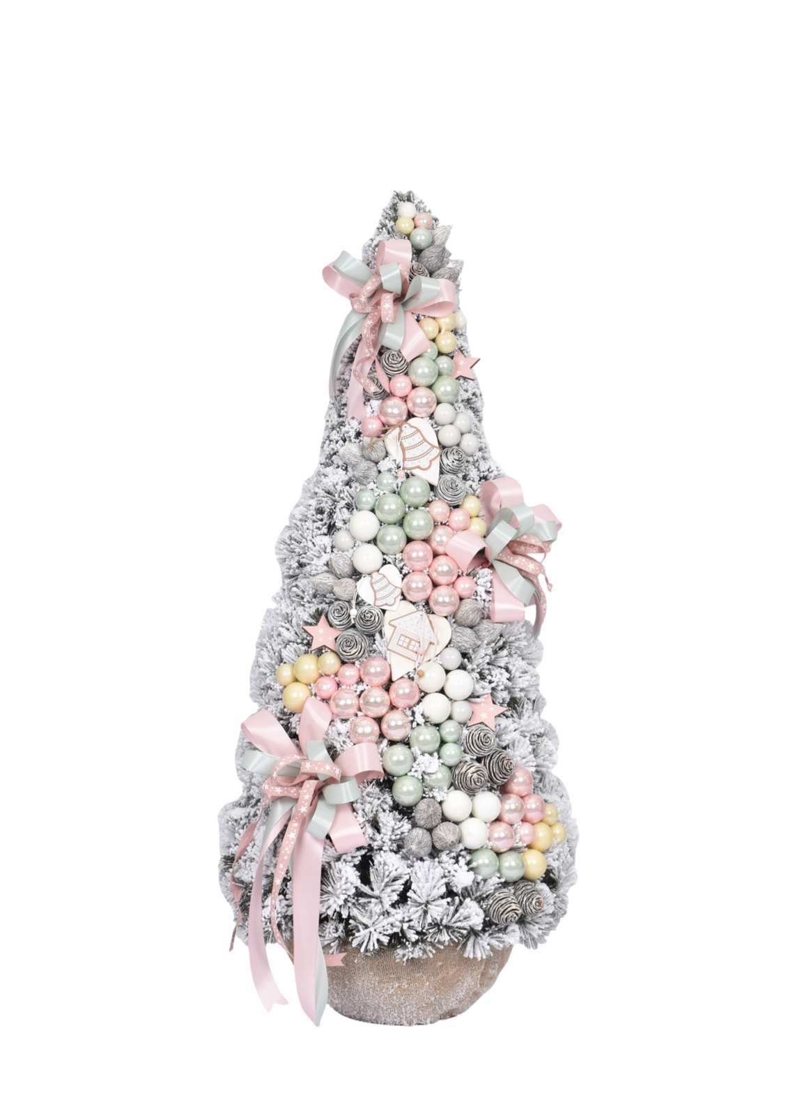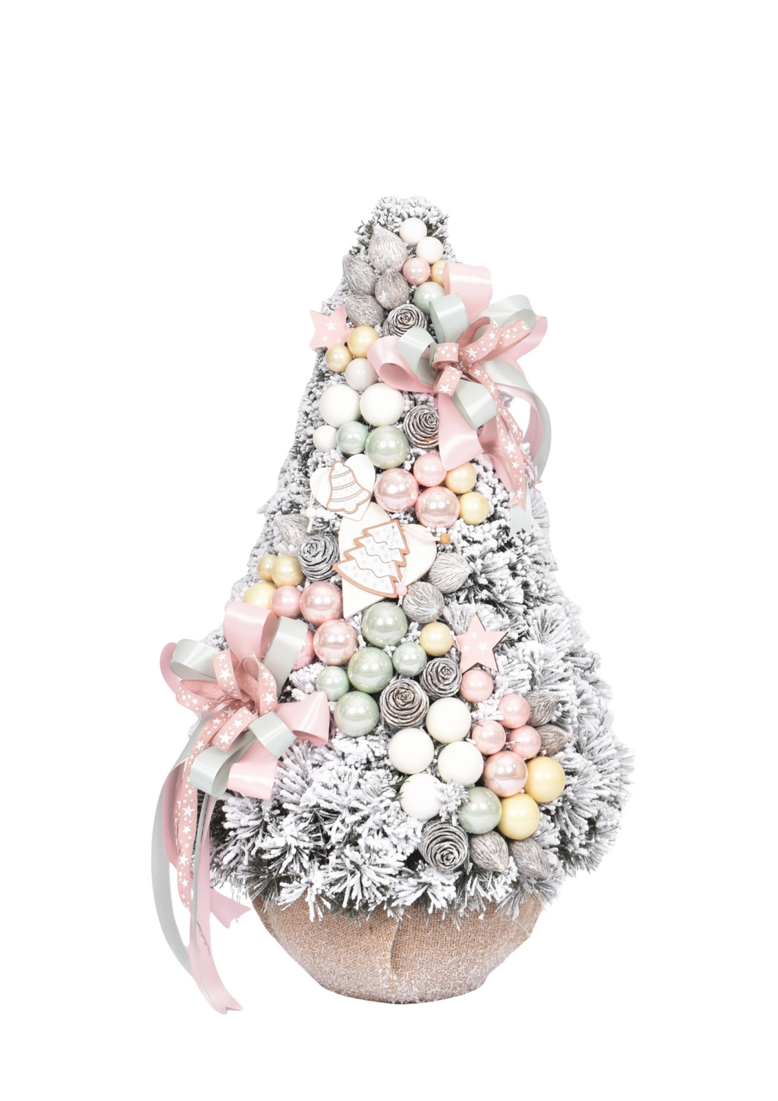 Pastelowa elegancja – delikatne odcienie różu, żółci, mięty i bieli w połączeniu ze śnieżoną bazą, tworzą efekt subtelnej, nowoczesnej dekoracji na sezon zimowy.