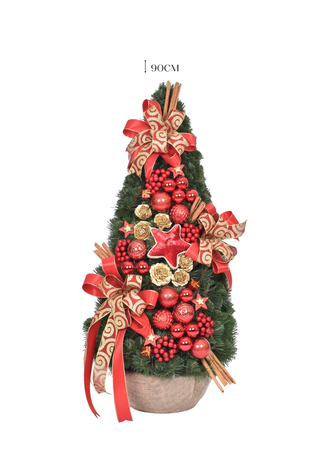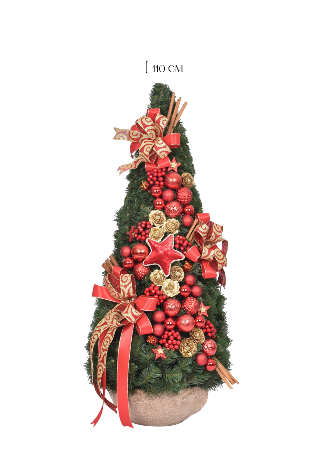 • Stwórz wyjątkową atmosferę Świąt w swoim domu lub biurze dzięki eleganckiej choince stożek, udekorowanej w ponadczasowej czerwono-złotej kolorystyce.