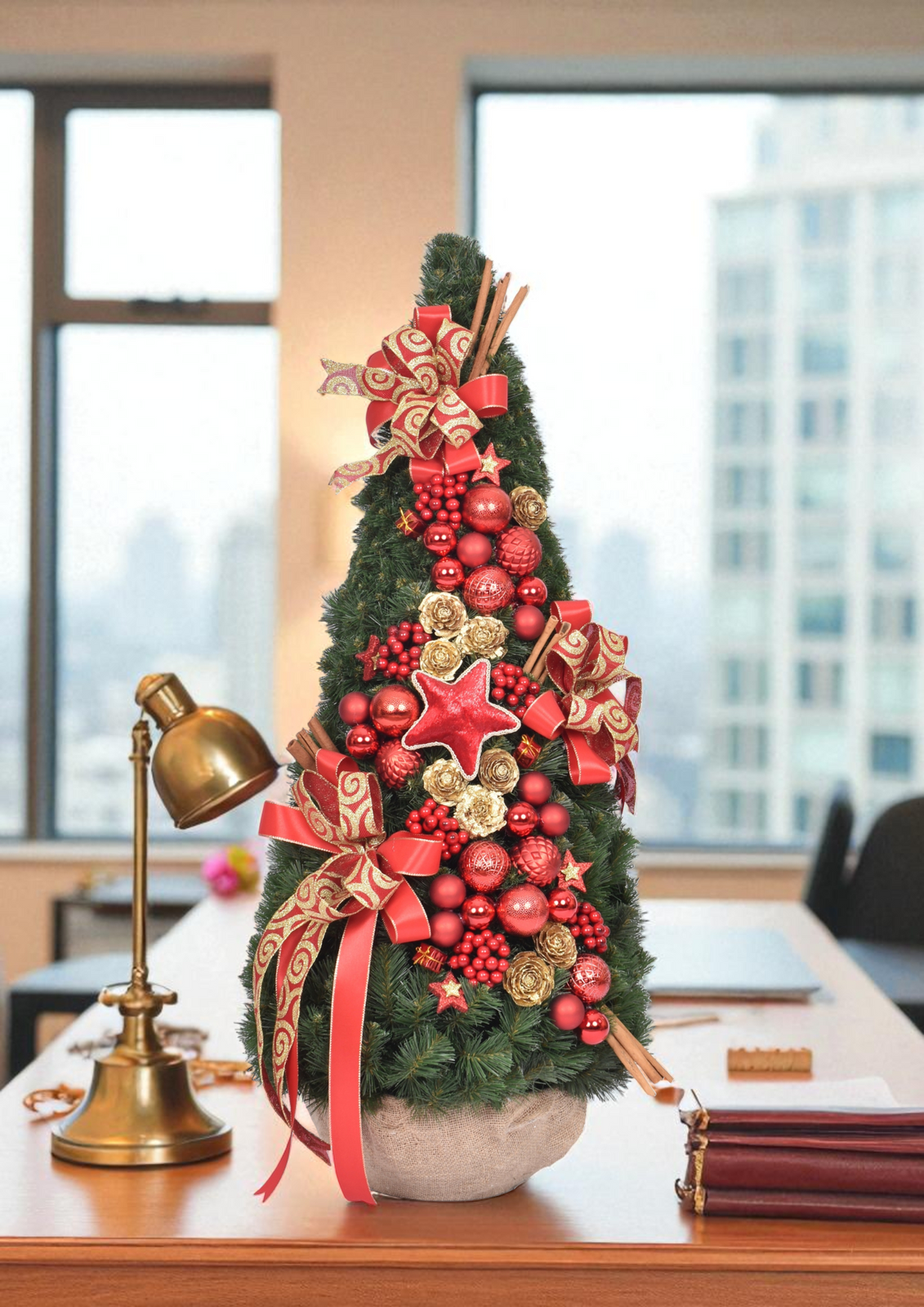Stwórz wyjątkową atmosferę Świąt w swoim domu lub biurze dzięki eleganckiej choince stożek, udekorowanej w ponadczasowej czerwono-złotej kolorystyce. To gotowa dekoracja, która od razu nada wnętrzu świątecznego blasku i sprawi, że poczujesz magię Bożego Narodzenia.