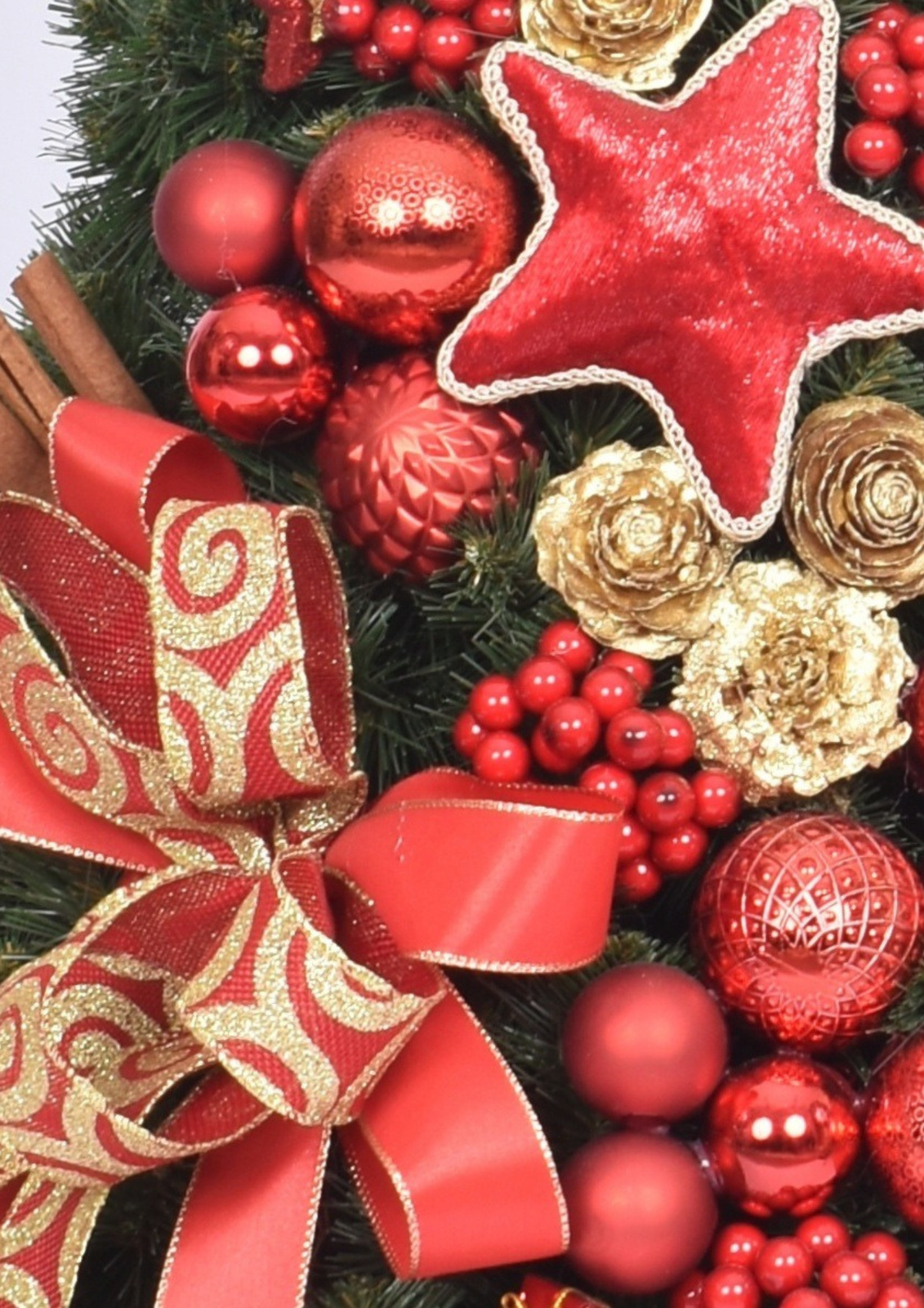 • Gotowa dekoracja – bogato zdobiona bombkami, kokardami, szyszkami i gwiazdkami, nie wymaga dodatkowych ozdób.