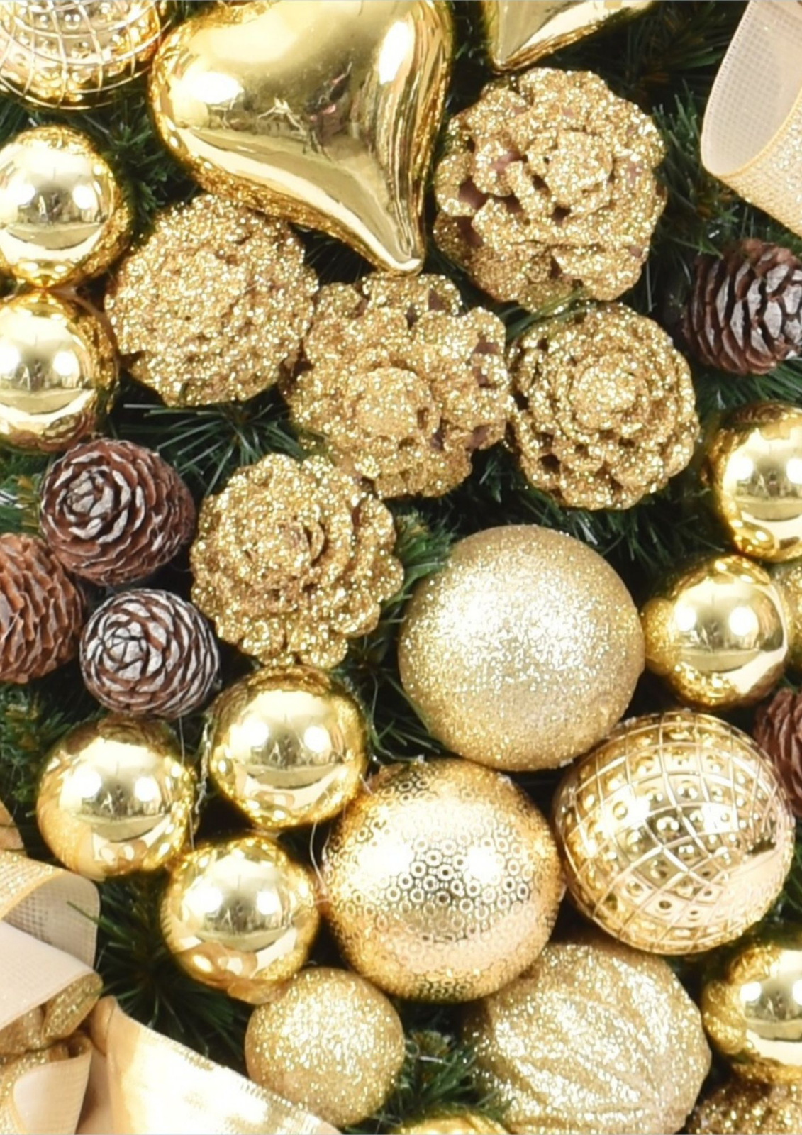 - Ten gotowy produkt zachwyca bogactwem dekoracji: bombki, szyszki, serca, kokardy i dodatki w różnych odcieniach złota zapewniają efekt wow w każdym wnętrzu.