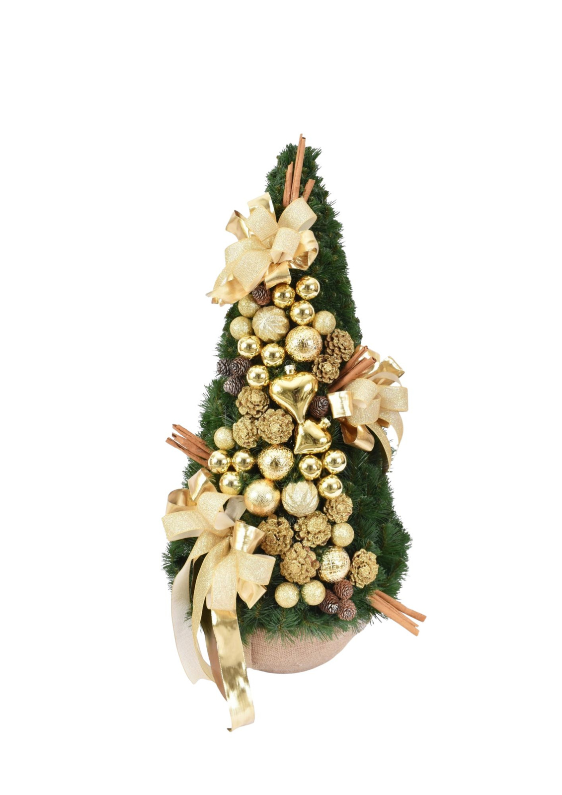 Szukasz spektakularnej ozdoby na Boże Narodzenie? Wybierz choinkę stożkową zdobioną na kolor złoty! Ten gotowy produkt zachwyca bogactwem dekoracji: bombki, szyszki, serca, kokardy i dodatki w różnych odcieniach złota zapewniają efekt wow w każdym wnętrzu.