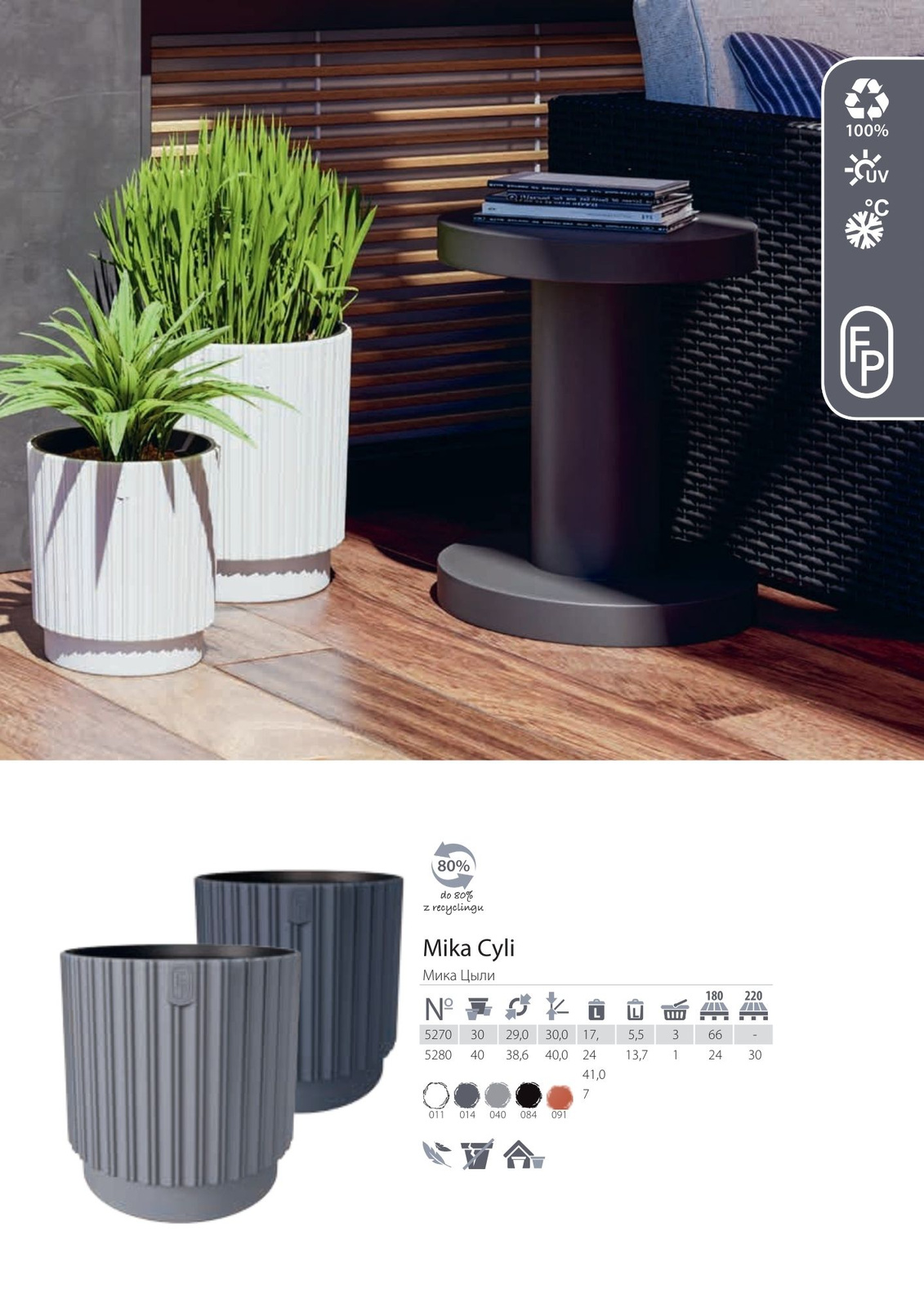 - Doniczka Mika Cyli to połączenie nowoczesnego designu z ekologicznym podejściem. Wykonana z wysokiej jakości tworzywa sztucznego z dodatkiem drewna, zachwyca eleganckim wyglądem oraz trwałością. Posiada wkład.