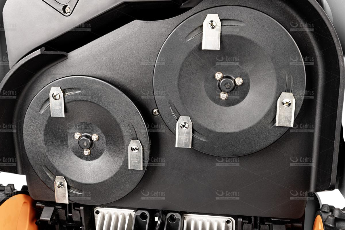 Dwie pływające tarcze tnące o szerokości 35 cm automatycznie dopasowują się do nierówności trawnika, gwarantując równomierne i dokładne koszenie.