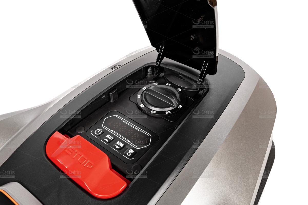 Sterowanie odbywa się za pomocą dedykowanej aplikacji mobilnej i czytelnego wyświetlacza, które umożliwiają pełną kontrolę nad harmonogramem koszenia.