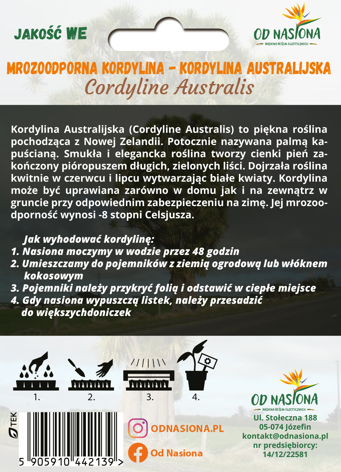 Kordylina Australijska (Cordyline Australis) to urocza roślina pochodząca z Nowej Zelandii, popularnie nazywana palma kapuściana. Ta smukła i elegancka roślina wytwarza cienki pień zakończony pióropuszem długich, zielonych liści. W okresie dojrzałym, w czerwcu i lipcu, kwitnie, prezentując białe kwiaty. Kordylina może być hodowana zarówno w domu, jak i na zewnątrz w gruncie, przy odpowiednim zabezpieczeniu przed zimą. Jej odporność na mróz wynosi -8 stopni Celsjusza.